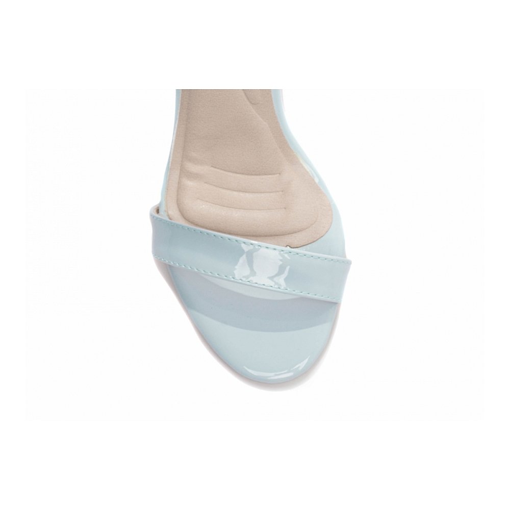 Palmilha: 8 mm de Espessura, Espuma em EVA, Revestida em Verniz Azul e Taloneira Napa Bege;