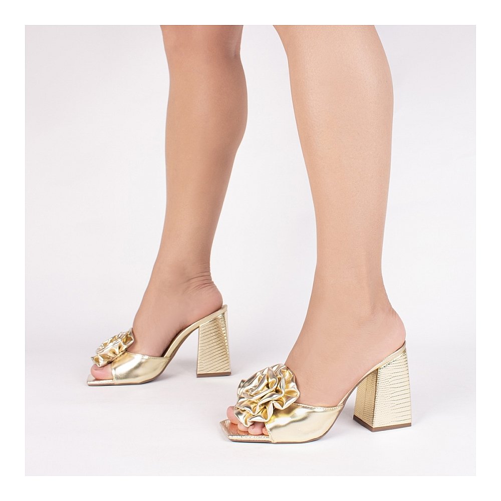 Salto: Grosso com 9 cm de Altura Revestido em Napa Lezard Ouro Ligth;