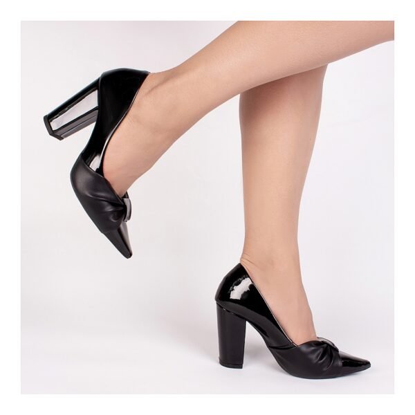 Salto: Grosso com 9 cm de Altura Revestido em Verniz Preto;